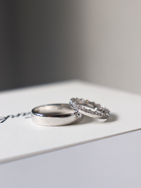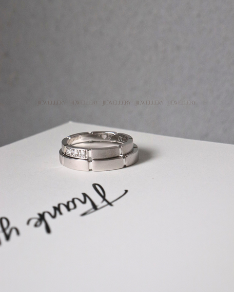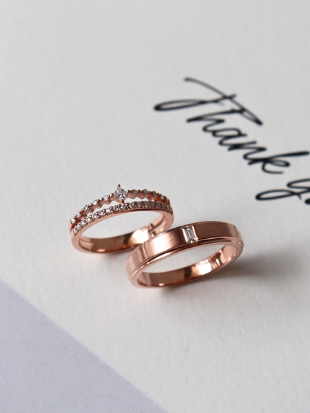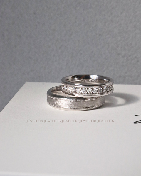 Nhẫn nam bản to điềm đạm với bề mặt đánh nhám sắc sảo, tạo cảm giác mạnh mẽ và vững vàng. Đối lập mà hài hòa với nhẫn nữ lấp lánh cùng vòng đá eternity 1.8li. Cả hai được kết nối đồng nhất bởi line trơn bóng, ôm trọn dải bi đều đặn nguyên vòng.