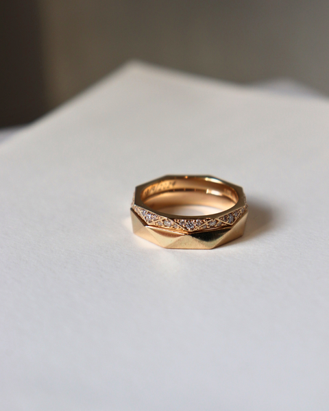 Lune mang cảm hứng từ hình học lục giác - một cấu trúc ổn định, mạnh mẽ trong nghệ thuật và kiến trúc. Những đường cắt góc cạnh được mài bóng, sắc nét. Nhẫn nữ đính đá tinh tế, sang trọng, làm nổi bật toàn bộ thiết kế.