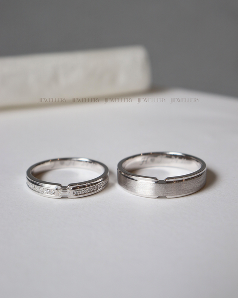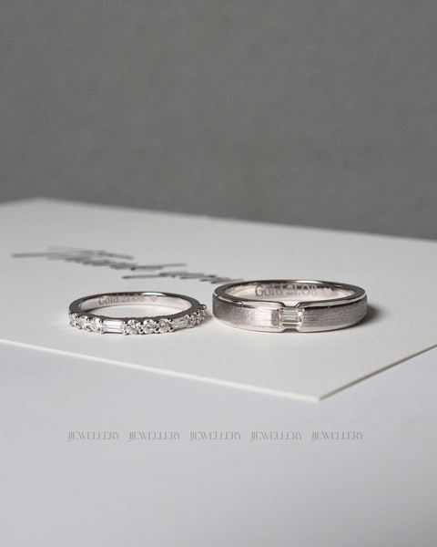 Nhẫn nam tối giản, không đính đá, kết hợp bề mặt nhám kim tinh tế, mang lại vẻ mạnh mẽ và vững vàng. Nhẫn nữ nổi bật hơn với nửa hàng đá tấm lấp lánh, kết hợp cùng viên baguette ở trung tâm, tạo cảm giác thanh lịch và kiêu hãnh.